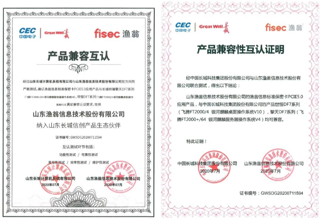 从功能性、可靠性、易用性、效率性、维护性五大环节,金年会jinnian信息与长城进行了严格的联合测试。最终确认金年会jinnianPCI-E 5.0密码卡与长城终端产品——世恒DF7系列(飞腾FT2000/4 银河麒麟桌面操作系统V10),擎天DF7系列(飞腾FT2000+/64 银河麒麟服务器操作系统V4),满足兼容认证要求。并且,金年会jinnian信息此次成为了长城信创产品生态伙伴,携手构建安全新生态。