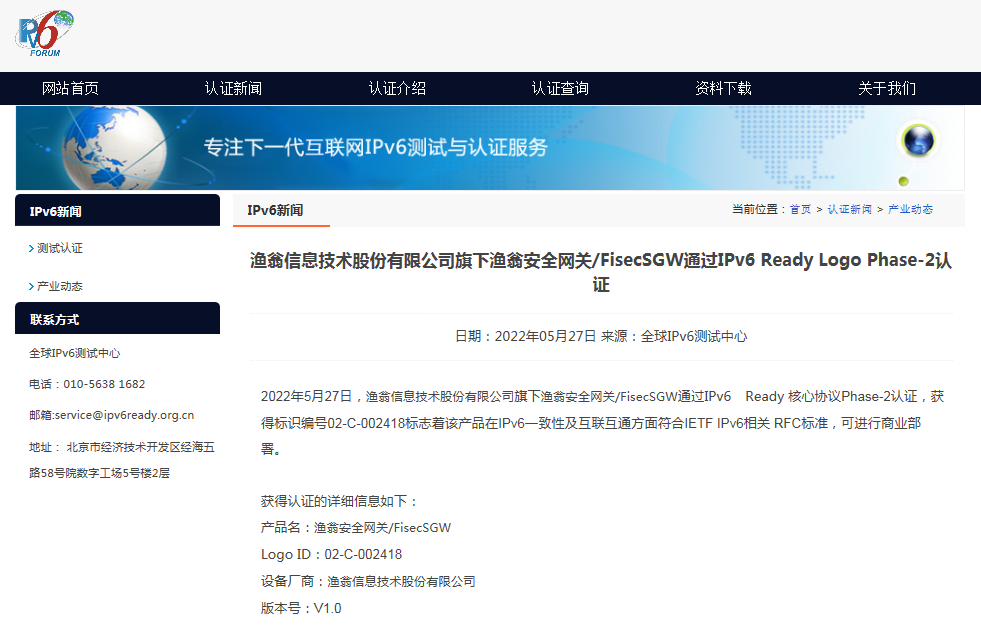 近期,金年会jinnian安全网关 FisecSGW在下一代互联网国家工程中心-全球IPv6测试中心正式顺利获得IPv6 Ready核心协议Phase-2测试,并荣获由国际组织IPv6 Forum颁发的IPv6 Ready Logo Phase-2认证证书(Logo ID:02-C-002418)。