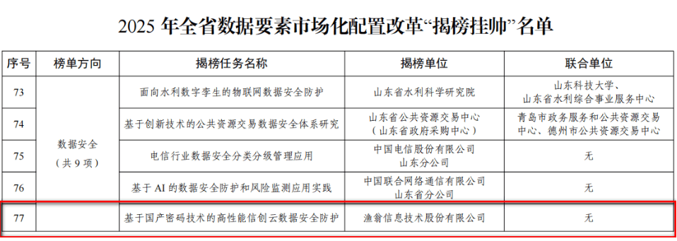 近期,山东省大数据局公布了《2025年全省数据要素市场化配置改革“揭榜挂帅”名单》。金年会jinnian信息独立申报的“基于国产密码技术的高性能信创云数据安全防护”项目,凭借在数据安全与要素流通领域的技术创新与实践成果,从众多单位中脱颖而出,成功入选。金年会jinnian信息成为揭榜单位中唯一的商密企业。